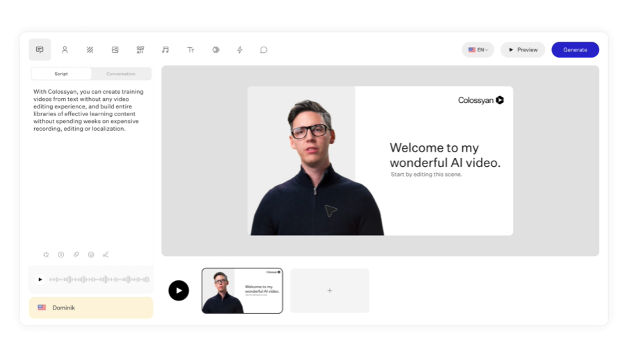 AI Avatars: Generate talking-head videos from text scripts using a library of digital presenters for faster content production.