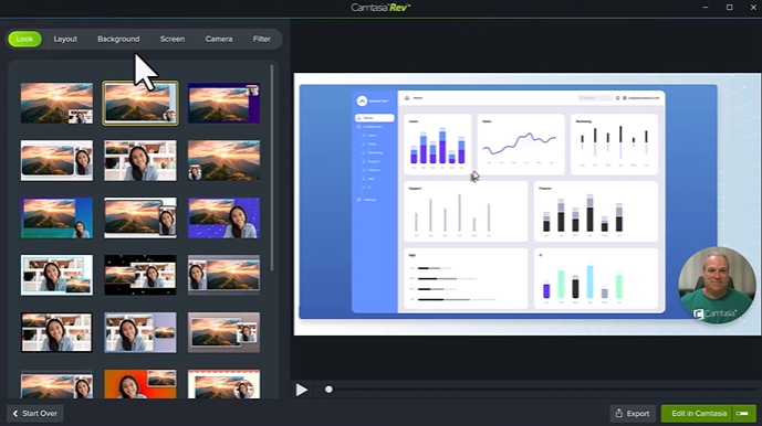 Camtasia Rev: Use AI-powered features to automatically remove background noise and webcam backgrounds from your recordings.